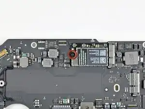 Удалите один винт T5 Torx длиной 2.85 мм, фиксирующий SSD к логической плате.