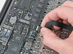 Вытяните лентовый кабель трекпада прямо из гнезда в направлении переднего края Air.