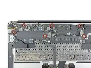 Удалите шесть винтов T5 Torx длиной 6.3 мм, фиксирующих логическую плату к верхней части корпуса.