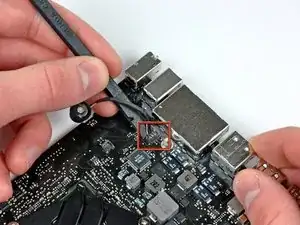 Используйте плоский конец лопатки, чтобы приподнять разъём кабеля микрофона с его гнезда на плате логики.