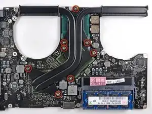 Если радиатор кажется приклеенным к плате логики после снятия всех восьми винтов, можно аккуратно использовать лопатку, чтобы разделить компоненты.