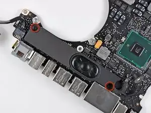 Снимите два винта Phillips 5 мм, крепящие левый динамик к материнской плате.