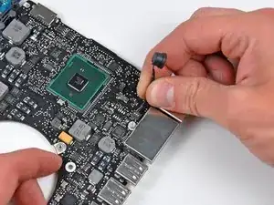 Снимите три винта T6 Torx 3,4 мм (3,1 мм), крепящие правый вентилятор к плате логики.
