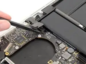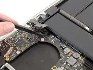 Используйте пинцет, чтобы удалить маленькую пластиковую крышку, расположенную в нижнем правом углу платы разъёма батареи.