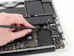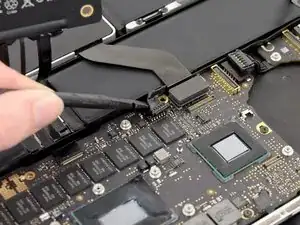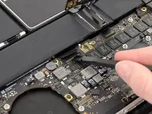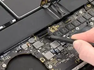 Удалите широкий винт T6 Torx по 6.4 мм, крепящий разъём батареи к сборке платы логики.