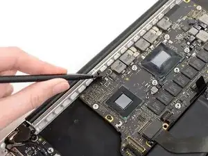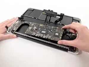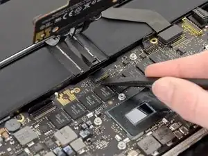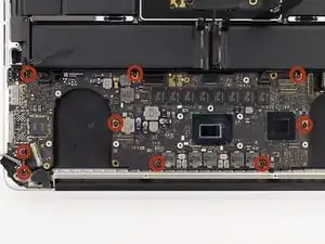 Удалите девять винтов Torx T5 длиной 3.3 мм, которые удерживают основную плату и плату MagSafe DC-in к верхнему корпусу.