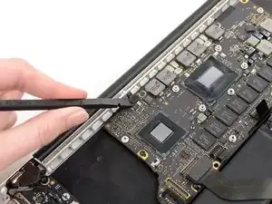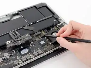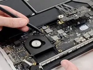 Используйте кончик лопатки, чтобы поднять удерживающую планку на разъёме кабеля левого вентилятора ZIF.