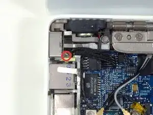 Уберите один винт Philips, который закрепляет плату MagSafe к нижней крышке.