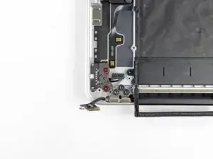 Снимите два винта Torx T5 длиной 2,5 мм, фиксирующие плату питания MagSafe к верхнему корпусу.
