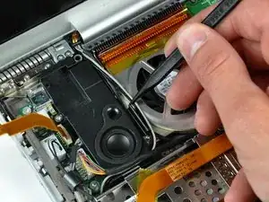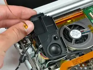 Поднимите левый динамик за задний край и выведете его из нижнего корпуса, следя за кабелями, лежащими в канавке ближе к переднему краю левого динамика.
