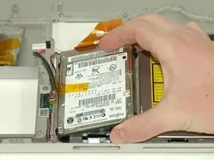 Снимите оранжевую ленту, фиксирующую ленту трекпада к плате логики.