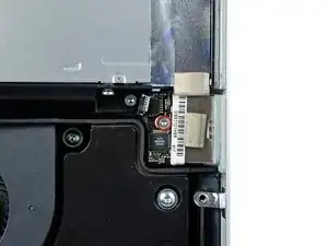 Поднимите свободный конец платы SD, чтобы освободить корпус пластикового вентилятора оптического привода, затем оттяните плату от края внешнего корпуса, чтобы освободить два монтажных штифта.