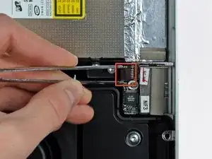 Используя пинцет, вытяните вертикальный ленточный кабель синхронизации из его гнезда на плате драйвера светодиодов в верхнем левом углу iMac.