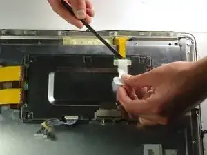 Отключите маленький белый разъём, идущий к кнопке питания дисплея.