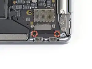 Используйте отвертку Torx T5, чтобы выкрутить два винта 2,9 мм, фиксирующие плату USB-C.