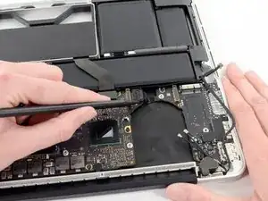 Снимите три винта T5 Torx 3,1 мм, крепящие правый вентилятор к сборке логической платы.