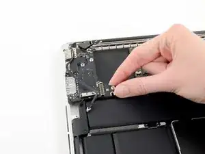 Снимите один винт T5 Torx 2,7 мм, крепящий плату AirPort к плате I/O.