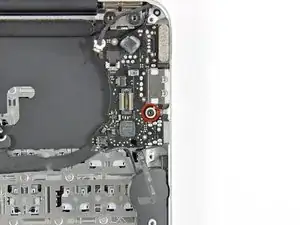 Снимите один винт Torx T5, 2,9 мм, который фиксирует SSD на плате логики.