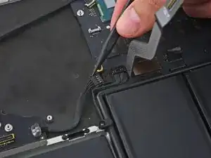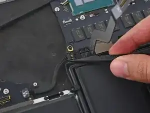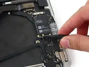 Вставьте кончик лопатки под каждый из антенных кабелей около разъёмов и поднимите их, чтобы отсоединить от платы AirPort.