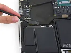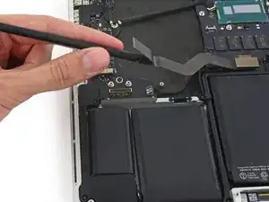Используйте плоский конец лопатки, чтобы поднять разъём аккумулятора прямо вверх из его гнезда на системной плате.