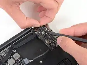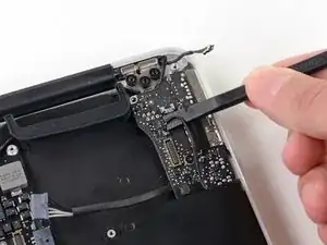 Потяните кабель камеры параллельно плоскости платы ввода/вывода в сторону петли Air, чтобы отключить его от гнезда, используя наконечник лопатки, чтобы помочь выдвинуть разъём из гнезда.