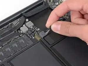 Возьмите прозрачную пластиковую петлю, прикреплённую к разъёму батареи, и потяните её в направлении переднего края Air, чтобы отключить батарею от логической платы.