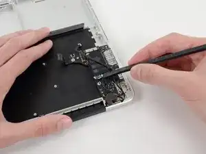Используйте плоский конец лопатки, чтобы поддеть и отключить три разъема антенн от платы AirPort.