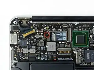 Снимите единственный 2,9-миллиметровый винт Torx T5, крепящий плату Wi-Fi/Bluetooth к системной плате.