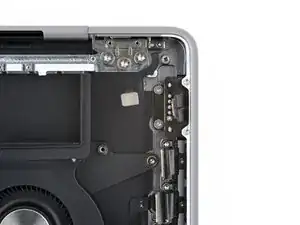 Скользящие защёлки вдоль заднего края MacBook удерживают нижнюю крышку. На этом шаге вы сдвинете нижнюю крышку от петель, чтобы освободить её от этих защёлок.
