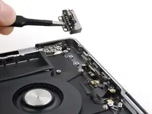 Используйте плоский конец лопатки, чтобы поддеть и отключить нажимной разъём трекпада от логической платы.