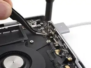Используйте отвертку Torx Plus 5IP, чтобы вынуть два винта длиной 2,7 мм, фиксирующие порт MagSafe.