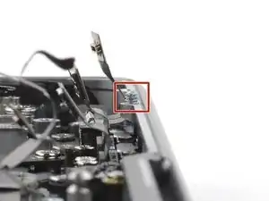 Кабель данных батареи приклеен к плате батареи и логической плате. На следующих шагах вы его отключите, отделите клей и удалите.