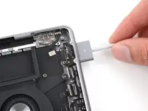 Используйте пинцет или пальцы, чтобы вытащить порт MagSafe из его гнезда и снять его.