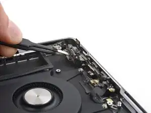 Используйте пинцет, чтобы отогнуть ленту, покрывающую ZIF-разъём микрофона справа от вентилятора.