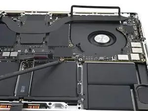 Отодвиньте любую ленту, закрывающую разъём кабеля данных платы батареи на логической плате.