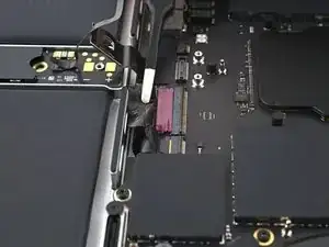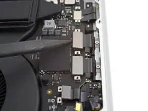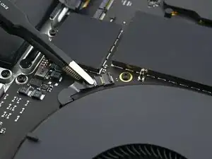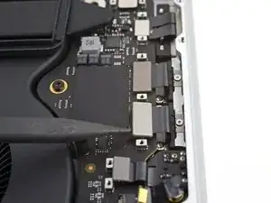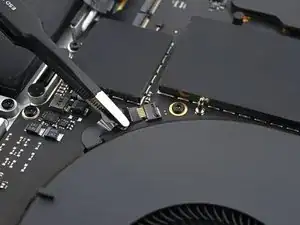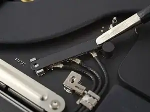 Используйте плоский конец лопатки, чтобы приподнять и отсоединить пресс-коннектор кабеля трекпада от логической платы.