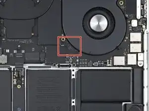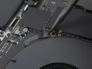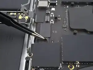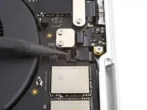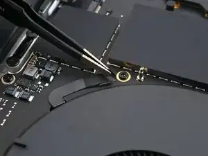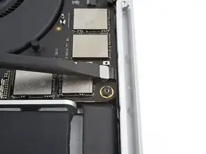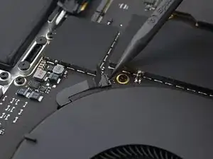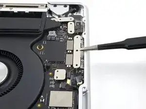 Используйте отвёртку Torx Plus 3IP, чтобы удалить два винта длиной 2,1 мм, фиксирующих скобу кабеля трекпада к логической плате.