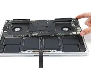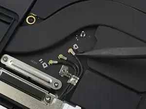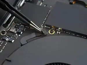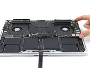 Снимите скобу кабеля трекпада пинцетом или пальцами.