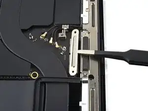 Снимите две крышки кабелей экрана с логической платы пинцетом или пальцами.