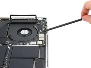 Проведите лопатку вокруг ближайшего угла, затем на половину высоты боковой стороны MacBook Pro.