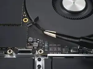 Используйте пинцет, чтобы оттянуть кабель вентилятора от платы логики и разъединить клей.