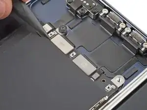 При сборке винты будут притягиваться к магниту в порту MagSafe. Используйте изогнутый пинцет, чтобы удерживать винты на месте при их закручивании.