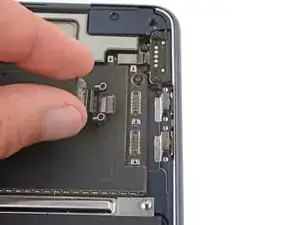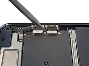 Используйте отвёртку T5 Torx, чтобы вывернуть четыре винта 3.7 мм, фиксирующие порты Thunderbolt.