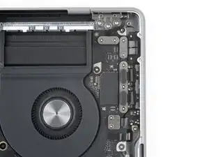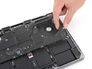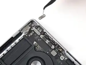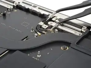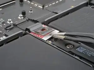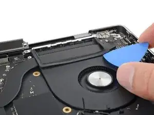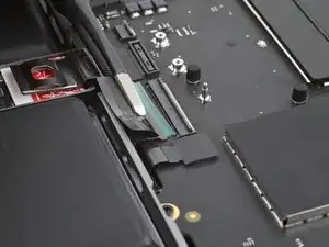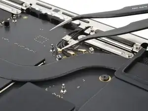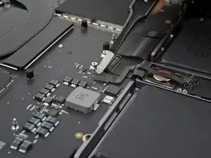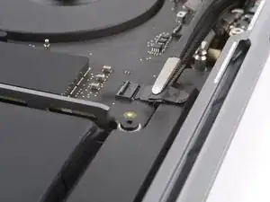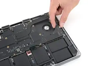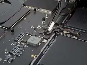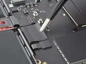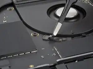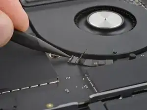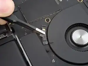 Используйте пинцет, чтобы отогнуть ленту, закрывающую ZIF‑разъем микрофона справа от вентилятора.