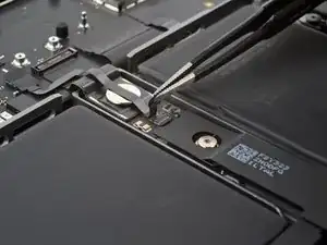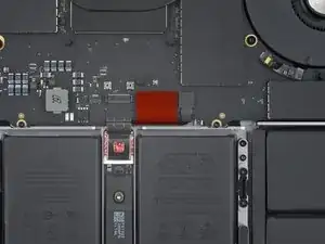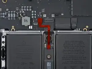 Тонкий клей фиксирует кабель трекпада к плате аккумулятора.