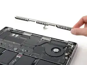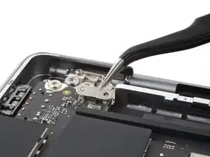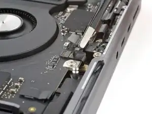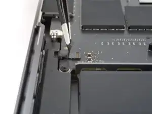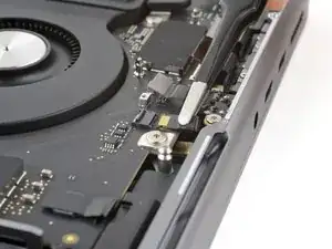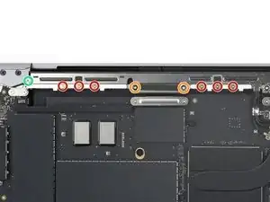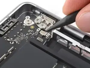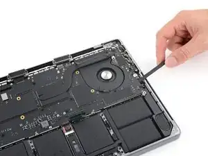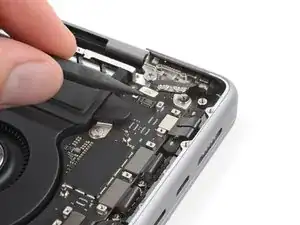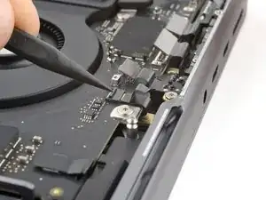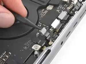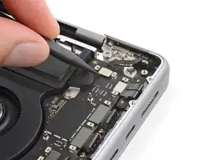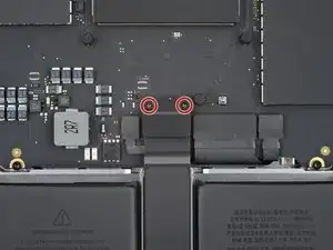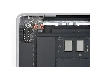 Используйте отвёртку 3IP Torx Plus, чтобы вынуть два винта длиной 2.1 мм, фиксирующих крышку разъёма трекпада.