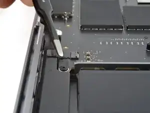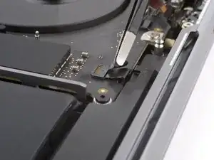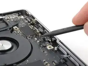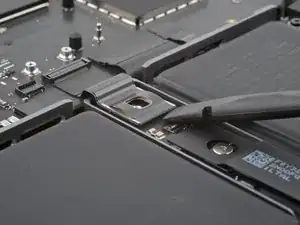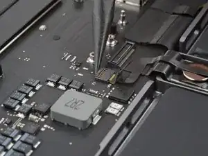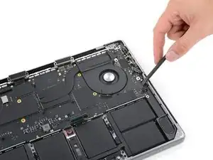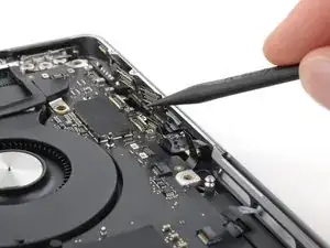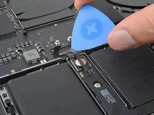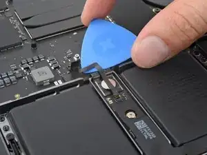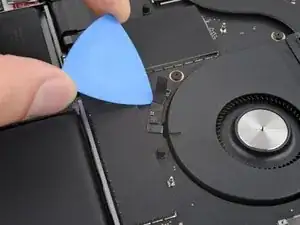 Используйте плоский конец лопатки, чтобы поддеть и отсоединить пресс-разъём трекпада от платы логики.