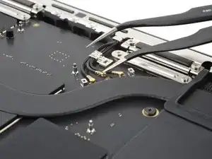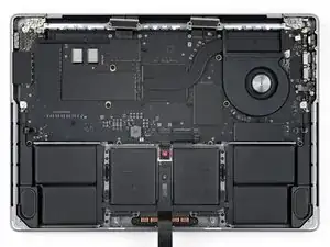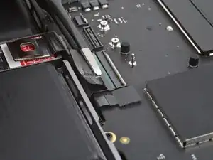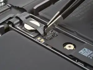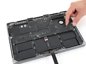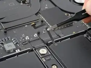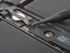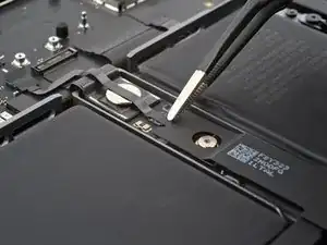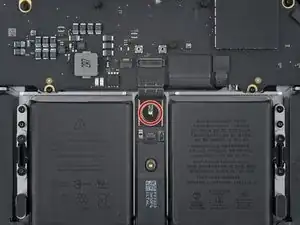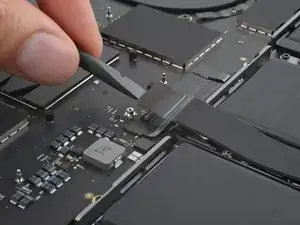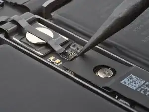 Кабель данных аккумулятора приклеен к плате аккумулятора и плате логики. На следующих шагах вы отключите его, разделите клей и снимете кабель.
