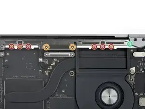 Используйте отвертку Torx 3IP, чтобы выкрутить девять винтов длиной 2.1 мм, фиксирующих четыре крышки разъёмов с правой стороны платы логики.