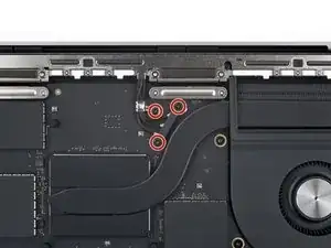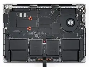 Используйте отвертку 3IP Torx Plus, чтобы снять два винта длиной 3.7 мм, фиксирующие середину материнской платы.